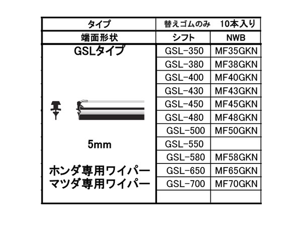 SHIFT グラファイト ワイパー 替えゴム 1箱10本入 GSL-550 550mm 幅5mm GSLタイプ 金属レールなし 化粧箱入 日本製 株式会社シフト