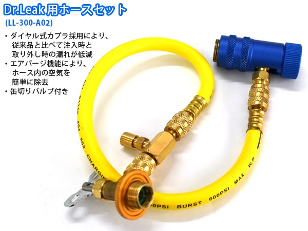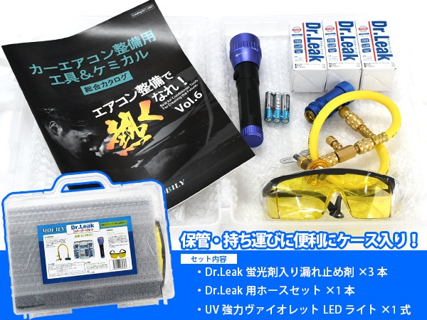 「Dr.Leak (ドクターリーク)」とはA/C漏れ止め剤、蛍光剤、潤滑油(PAG)、R134aガス入り極めて「機能的」かつ「高品質」なプレミアム品です 冷媒ガス漏れが発生する際に、その部位の圧力と温度の低下により、冷媒ガス配管の外側から内部の表面まで徐々に集まり、かさぶた状のシール油膜を形成し、冷媒ガスの漏れを止めます。 すべてが揃った「スターターキット」 ■セット内容■ ・(LL-DR1) Dr.Leak 蛍光剤入り漏れ止め剤 ×3本 ・(LL-300-A02)Dr.Leak用ホースセット ×1本 ※Dr.Leak用注入ホース エアパージ付/R134a缶切りバルブ・(TP-OPUV)OPTI-PRO UV強力ヴァイオレットLEDライト ×1式 <Dr.Leak特徴> 安全性 SAEJ2997規格認定品。ノーポリマー配合 国内外カーエアコン&回収機メーカーによるテスト済み 即効性 注入後15〜30分ほどで、微小な冷媒ガス漏れはほとんど止まる 永続性 漏れ止め効果、漏れ検知効果は半永久 経済性 従来のカーエアコン修理費用より、はるかに経済的な価格 ブランド性 世界のカーメーカーで新車出荷時に採用されている特許品と純正品を使用 ・対応冷媒:R134a ・対応コンプレッサオイル:PAG ●蛍光剤入りクールシール:13g ●潤滑油:7g ●R-134aガス:30g (内容量:50g/乗用車一台分) トレーサーライン社製の蛍光剤、クールシールを使用しております。 !注意! ※HV/EV車には使用不可 ※ご使用の際は本商品の箱に記載の取り扱い説明をご確認頂きご使用ください。 【ご 注 意】 ※納品後の交換は、ご注文品番以外のものが届いた場合を除き、交換・返品などはお受けいたしかねます。 ※メーカー在庫の為お急ぎの場合は、納期の確認をお願い 致します。 通常1〜2日(土・日・祝日を除く)で発送となります。 メーカー欠品の場合(2〜3週間)は、その旨連絡致します。 お急ぎの方は、必ずご注文前に在庫の確認を御願い致します。