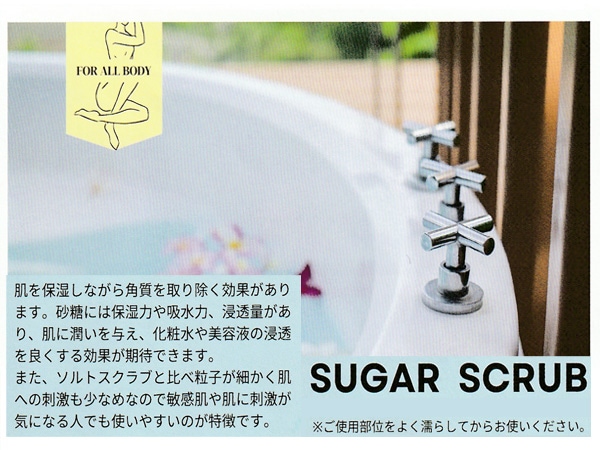 保湿をしながら角質を取り除く効果があり、砂糖には保湿力、浸透力があり肌に潤いを与えます。