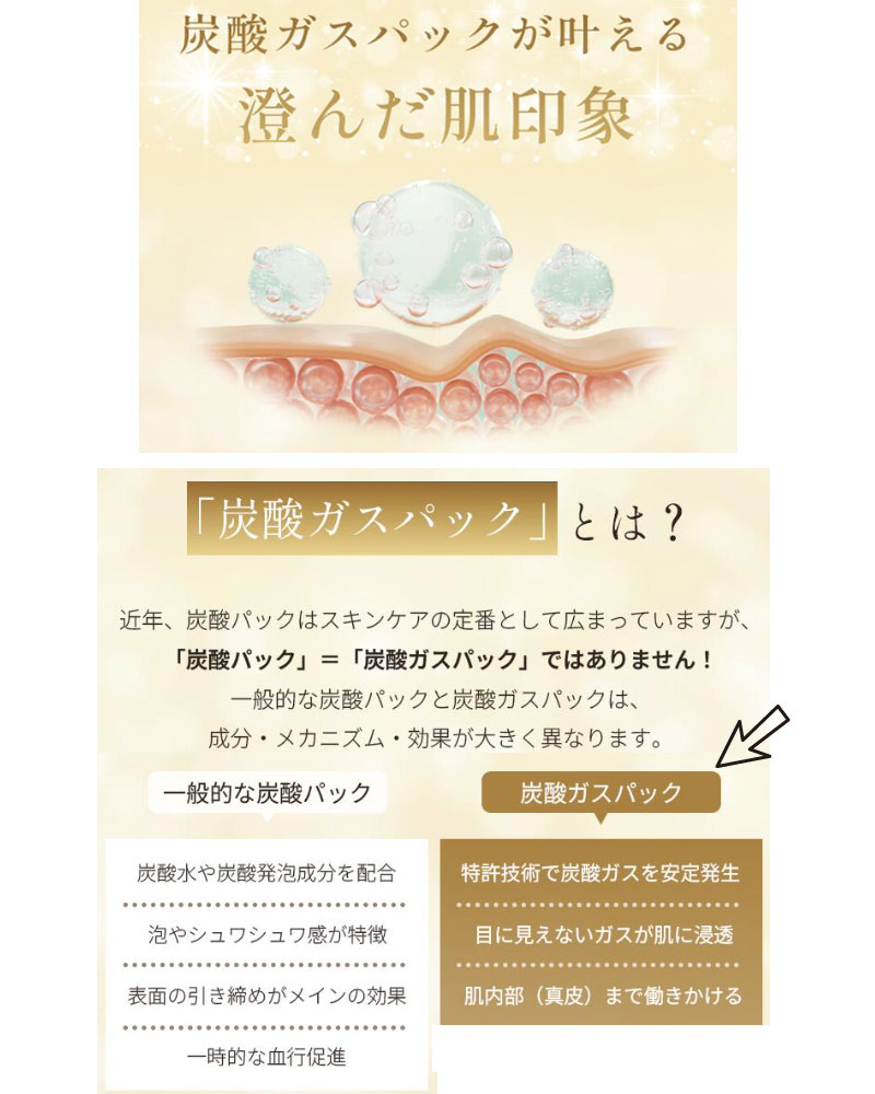 多くの製品『炭酸パック』と『炭酸ガスパック』は名前は似ていますが中身も効果も大きく違います。